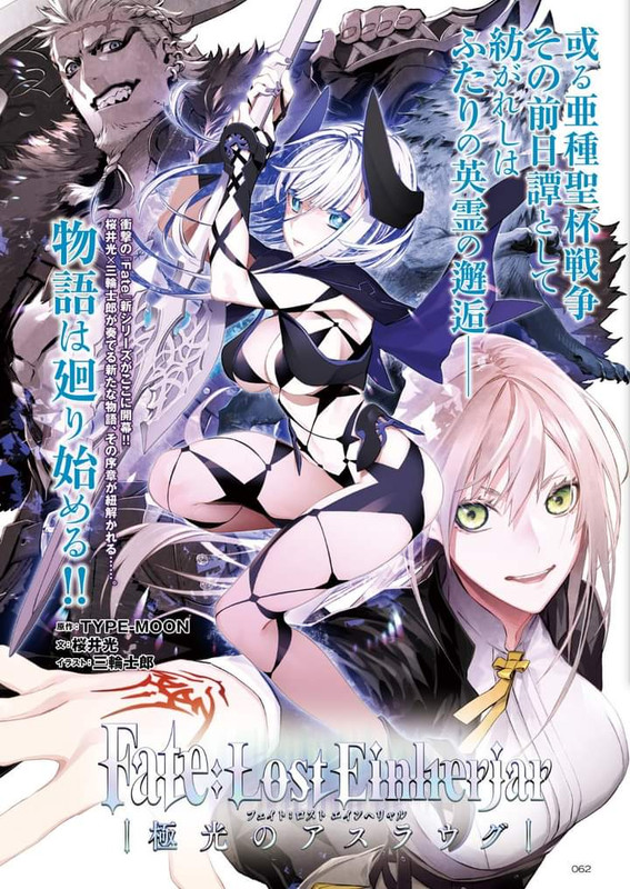 Nuova serie di Fate:Fate/Lost Einherjar con protagonisti Berserker(Ragnar Lodbrok) e Archer(Aslaug) la loro Master è un ex membro degli Yggmilenia (saga di light novel scritta da Hikaru Sakurai e illustrata da Shirow Miwa)