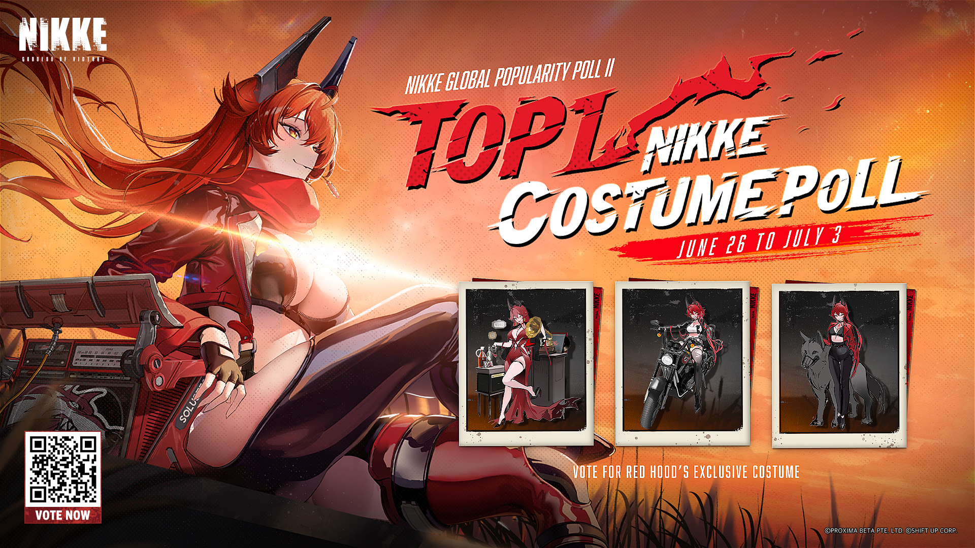 Durante il sondaggio sulla popolarità globale Doki Doki NIKKE II, Red Hood è arrivata prima nella votazione! Pertanto, verrà regalato un set di costumi di Red Hood a tutti i comandanti! Vai alla pagina web dell'evento, vota per il tuo plan preferito e condividi i risultati della votazione sui social per ricevere 1 voucher reclutamento!