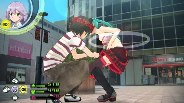 In modalità esplorazione andiamo in giro per Akihabara. Di solito abbiamo sempre una destinazione da raggiungere per progredire con la storia, ma siamo anche liberi di esplorarla come vogliamo. Si può parlare con la gente che si incontra, si può andare nei vari negozi ad acquistare oggetti e altra roba. Su questo aspetto ci torniamo più avanti in dettaglio. La fase di battaglia inizia quando si incontrano dei nemici. Il giocatore può attaccare gli avversari con calci e pugni, se ha armi equipaggiate come bastoni o ombrelli si possono usare quelli. Il tasto triangolo serve per gli attacchi alla testa, cerchio per gli attacchi al corpo e X per gli attacchi alle gambe. Per sconfiggere un nemico bisogna colpirlo in una zona del corpo abbastanza volte per indebolirlo, e a quel punto gli si potrà strappare via l’indumento che indossa: maglietta per il corpo, pantaloni alle gambe e bandana o cappello per la testa ovviamente. Una volta nudo, il “vampiro” sarà esposto completamente alla luce del sole e questo ne provocherà la sconfitta. Un nemico battuto dona esperienza che permette di upgradare l’equipaggiamento, e i suoi indumenti. Dato che anche Nanashi è un Synthisters, i nemici cercheranno di fare lo stesso, tentando di denudarci, e se ci riescono è game over.