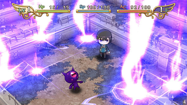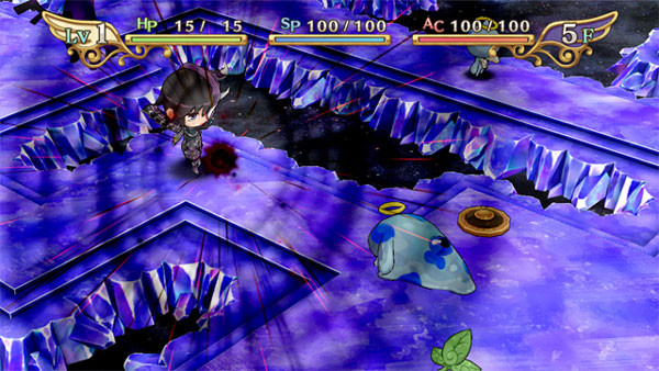 La parte relativa all’esplorazione dei dungeon è invece quella più spiccatamente rpg, con oggetti, equipaggiamenti, status alterati e nemici da affrontare in combattimenti a turni. I dungeon a scacchiera si compongono di diversi piani e nonostante l’apparenza pucciosa dei nemici e del vostro chibi-Shin, il livello di sfida è sufficientemente impegnativo, poiché morire significa non solo dover ricominciare dal primo piano ma anche perdere tutto l’equipaggiamento e gli oggetti ottenuti. I nemici non sono particolarmente ostici ma è impossibile andare avanti senza aumentare di livello ripetendo più volte i dungeon già fatti, il che alla lunga rende l’esperienza di gioco noiosa e ripetitiva. Altra nota dolente in tal senso sono i monotoni pattern di attacco dei memici che si limitano a ricambiare ogni vostro colpo in una costante sequenza “turno di Shin-turno del nemico-turno di Shin-turno del nemico” e così via. A compensare però vi è una seconda caratteristica peculiare del gioco, ovvero, la possibilità di “Deizzarsi”, cioè passare dallo status di Dio a quello di Demone con un semplice click sui tasti L2 ed R2, permettendo così a Shin di usare le varie skill angeliche e diaboliche apprese nella sfereografia. I nemici sono deboli a questa o quella forma e sarà importante switchare da una all’altra per ottenere il massimo risultato. Non è possibile però rimanere costantemente in forma divina, poiché oltre che alla barra dell’energia, dovrete prestare attenzione a quella degli SP, che controlla appunto la durata della deizzazione e diminuisce con il passare del tempo e l’uso delle tecniche speciali. Allo stesso tempo, bisogna tenere in conto la barra AC che diminuisce camminando. Insomma, i movimenti, gli attacchi, i posizionamenti e l’uso degli oggetti vanno distribuiti con attenzione, per tanto non è possibile in The Awakened Fate Ultimatum avventurarsi con furia cieca all’interno dei dungeon.