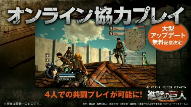 Koei Tecmo ha annunciato l'arrivo di una modalità cooperativa online per 4 giocatori di Attack on Titan, il nuovo gioco dedicato a L'Attacco dei Giganti, fissato per il 24 marzo tramite un grosso aggiornamento.