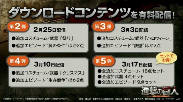 Ricordiamo che Attack on Titan uscirà il 18 febbraio in Giappone per PlayStation 4, PlayStation 3 e PlayStation Vita; mentre in Occidente arriverà nel corso del 2016.
