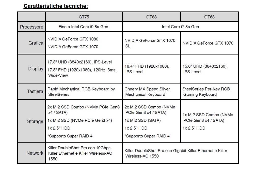 I portatili da gioco stanno raccogliendo sempre più consensi grazie ai videogiocatori che hanno poco spazio a casa o quelli che partecipano a tornei in giro grazue al buon rapporto tra potenza e dimensioni/trasportabilità, per questo molte case hanno delle serie di prodotti dedicate a questo settore del mercato, tra le tante realtà spicca MSI che ha appena rinnovato la serie GT introducendo nuovi modelli. I nuovi prodotti appena annunciati (serie GT 75, GT83 e GT63) adottano CPU Intel di 8^ generazione fino a Core i9, GPU singole e SLI fino a GTX 1080, tastiera meccanica, schermi full hd o 4k permettendo all'azienda di dichiarare che "garantiscono prestazioni di livello desktop in grado di infrangere tutti i record anche on the go".