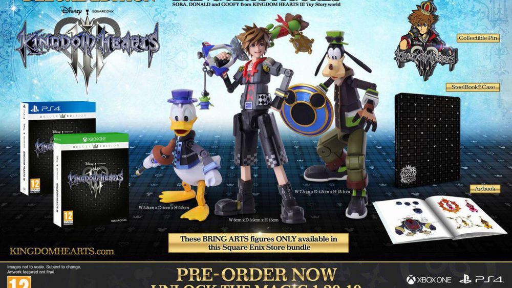 - Deluxe Edition + Bring Arts Figures (229,99 €): Contenente i tre oggetti menzionati sopra e le tre Bring Arts di Sora, Paperino e Pippo dal mondo di Toy Story