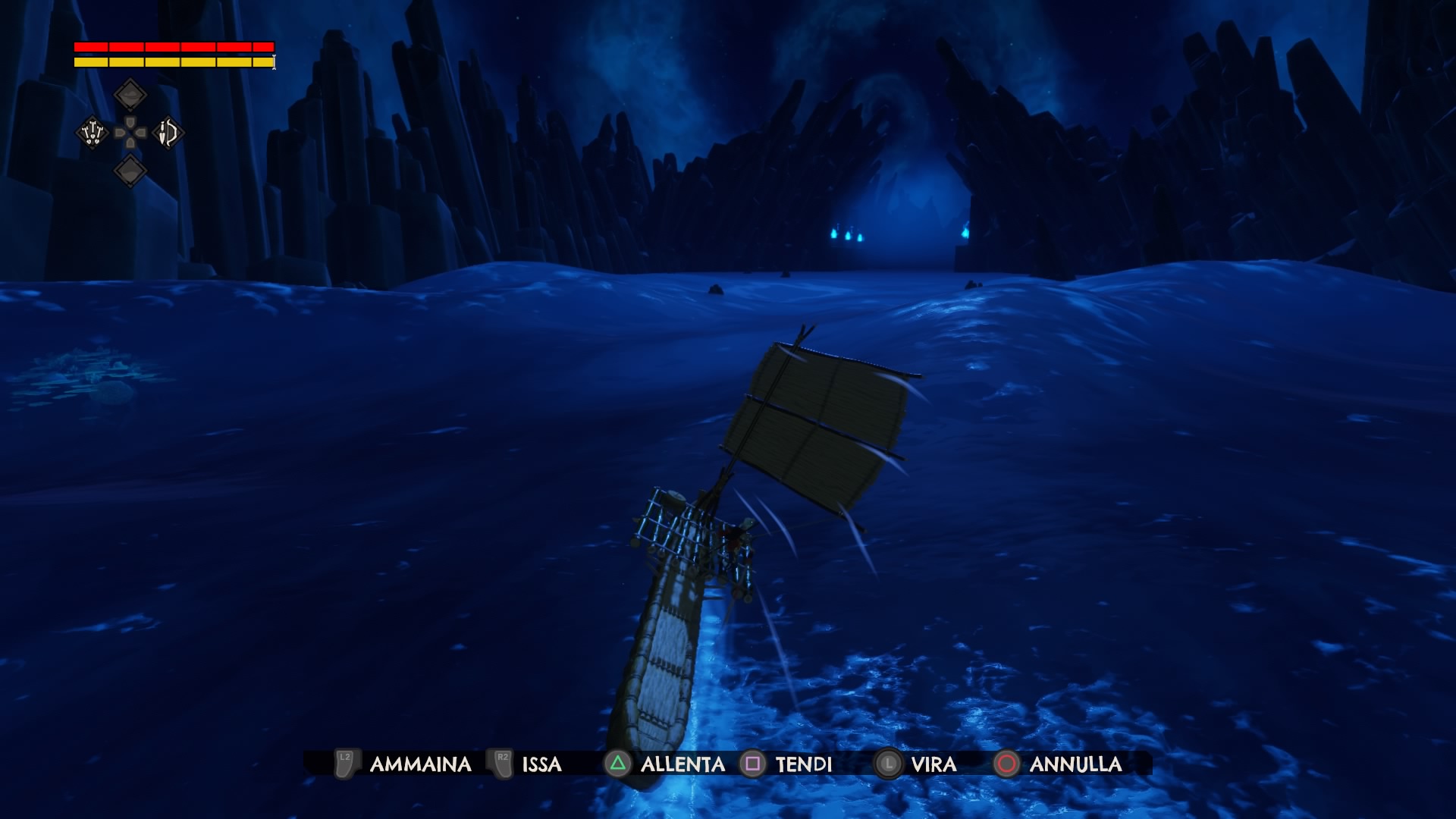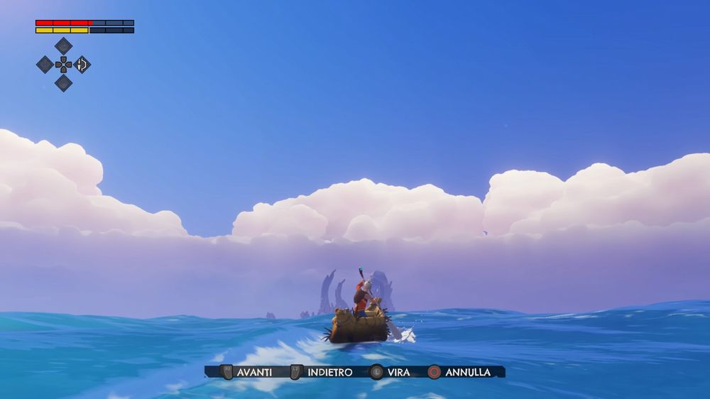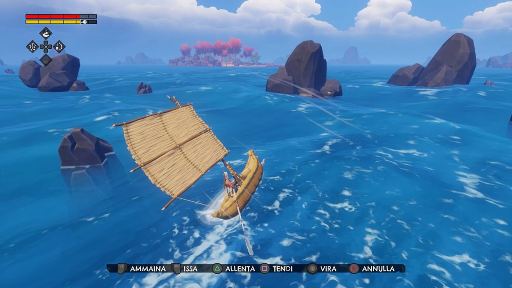 Finché si vuole spingere la barca in mare dopo averla ‘posteggiata’ sulla spiaggia e si perde qualche minuto aprendo ripetutamente e involontariamente le ceste piene di scorte non è un problema, ma quando si è in mare, magari in una situazione di pericolo, e invece di prendere il controllo della barca e mettersi in fuga si inizia a rovistare fra le spezie il fastidio si trasforma in rabbia. Un’altra scelta davvero bizzarra sul fronte navigazione risiede nella gestione del remo. Quando si aggiunge la vela alla propria barca, uno dei primissimi elementi extra che si sbloccano e che migliora sensibilmente la velocità, si perde completamente la possibilità di remare.