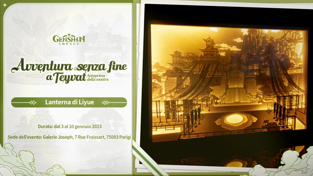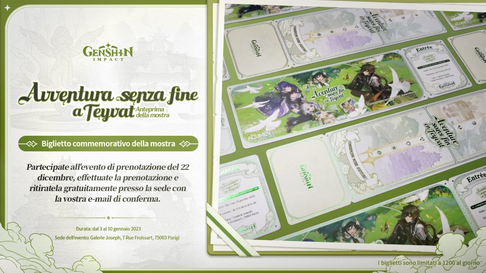 Dal 3 al 10 gennaio si terrà a Parigi la mostra "Avventura senza fine a Teyvat" dedicata a Genshin Impact, visitando l'esibizione multimediale, aperta a tutti e con ingresso gratuito, i fan del gioco e i curiosi potranno esplorare 4 aree ricche di contenuti in cui ammirare l'arte concettuale, le bozze create dagli sviluppatori del gioco (tra le quali quelle dedicate alla creazione di 2 dei personaggi più amati ovvero Yun Jin e Xiao) e le tantissime opere create dai fan comprese le ultime opere del duo di artisti francesi ZIM&ZOU, e potranno anche ascoltare brani composti da musicisti e orchestre rinomate. All'ingresso ci sarà un modello 3D di 14 m² della mappa di Teyvat, raffigurante le quattro nazioni disponibili fin qui nel gioco. Avventura senza fine a Teyvat si terrà alla Galerie Joseph situata a Parigi, 7 Rue Froissart, dal 3 al 10 gennaio 2023 e sarà aperta a tutti e con ingresso gratuito.