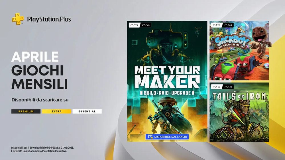 Un mese ricco di avventure variegate che potranno soddisfare i polpastrelli di tutti i giocatori; in attesa dell'arrivo dei tre nuovi titoli ricordiamo che fino al 3 aprile si potranno riscattare i precedenti giochi di cui potete leggere le nostre recensioni, ovvero Code Vein, Minecraft Dungeons e Battlefield 2042 mentre dal 4 aprile arriveranno Meet Your Maker, Tails of Iron e Sackboy: Una Grande Avventura. Cosa ne pensate, siete soddisfatti della rosa di aprile 2023?