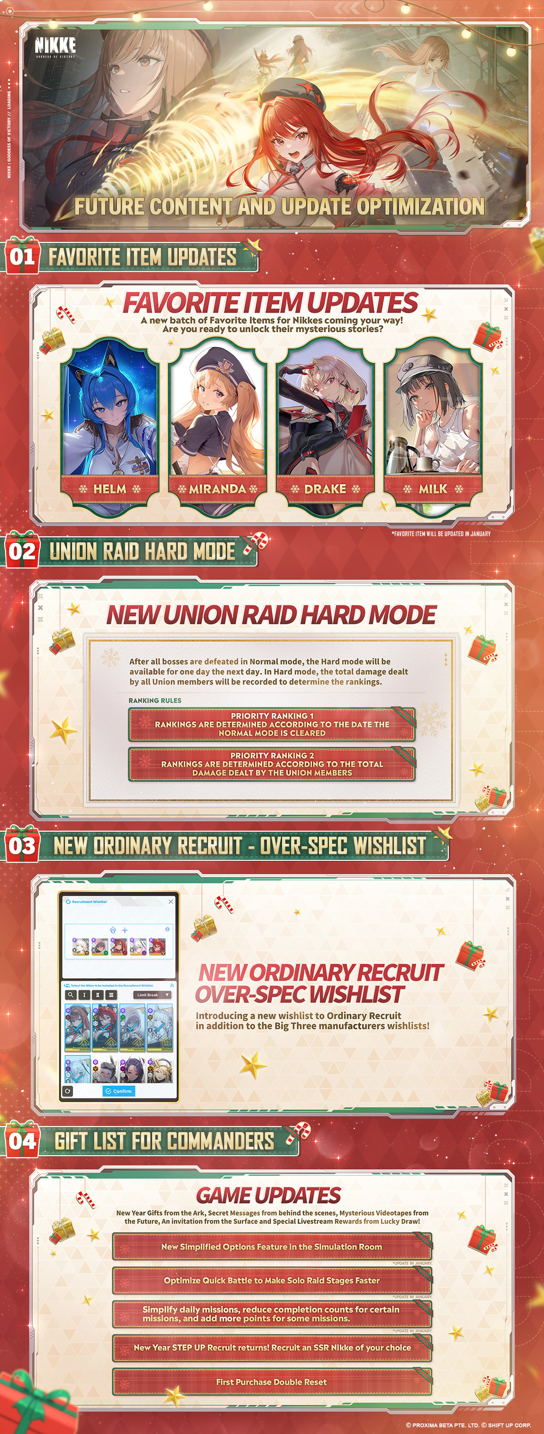 Dopo aver completato tutte le fasi, sarai ricompensato con una New Year SSR Selection Box, dalla quale potrai selezionare 1 SSR Nikke a tua scelta (esclusi Pilgrims, Over-spec Nikke, Limited-Time Recruitment Nikke e altri Nikke specifici. Consulta la Check List in New Year SSR Selection Box.
